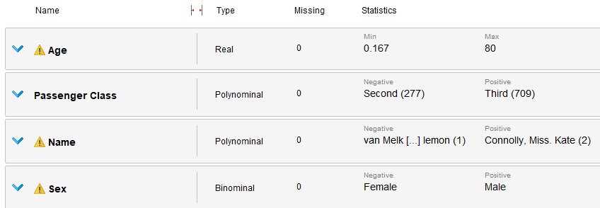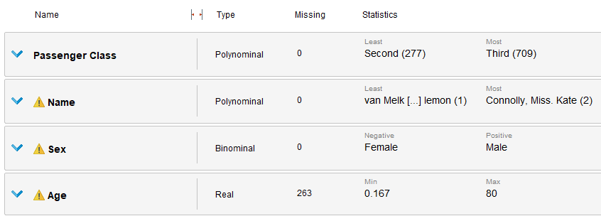 Un analisis inicial en rapidminer, nos revela la cantidad de datos faltantes en cada uno de los atributos del dataset. En este caso, vemos como para la columna de edad, hay 263 datos faltantes de 1309. Al ser un gran porcentaje de los datos, de no realizar ninguna acción, esto podría impactar de forma negativa el rendimiento de un posible modelo. Rapidminer, ofrece un bloque especial para estos casos que se llama "Replace missing values" que hace lo que su nombre indica, reemplaza los datos faltantes con una técnica definida por el usuario. Entre estas técnicas, está el uso del promedio, el máximo o mínimo de los valores encontrados para esa columna, ponerle un 0 o simplemente, llenarlos con un valor arbitrario.