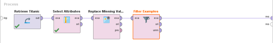 En conjunto, se utiliza el operador "Filter examples" para eliminar por completo las filas con datos faltantes en el resto de los atributos, dado que estos son muy pocos y no afectarán en gran medida al dataset (El operador "Select attributes", fue utilizado para seleccionar la columna "Age").