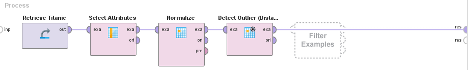 Finalmente, tenemos un dataset limpio, sin valores faltantes. Para manejar outliers y normalizar la data, Rapidminer cuenta con dos bloques, "Detect Outliers" que utilizando un método configurable, marca los datos que considera fuera de rango y nos permite luego eliminarlos. Este operador es usualmente utilizado en conjunción a uno de normalización. La normalización, es un proceso de estandarización de datos a un rango específico que permite que estos se lean de la misma forma para cualquier dato en el conjunto, es muy util y casi que imprescindible utilizarlo al preparar datos.